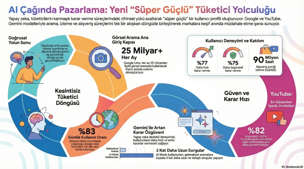 Tüketiciler artık “alışverişe gitmiyor” — her zaman alışveriş yapıyorlar. Arama, izleme, kaydırma ve satın alma eylemleri artık ayrı aşamalar değil; birbirinin içine geçmiş, eşzamanlı bir döngü. Bir kullanıcı YouTube’da video izlerken gördüğü ürünü Google Lens ile anında tarıyor, yapay zekanın özetlediği yorumları okuyor ve ödemeyi aynı ekranda tamamlıyor. İlham anı ile sahip olma anı arasındaki mesafe neredeyse sıfırlandı.