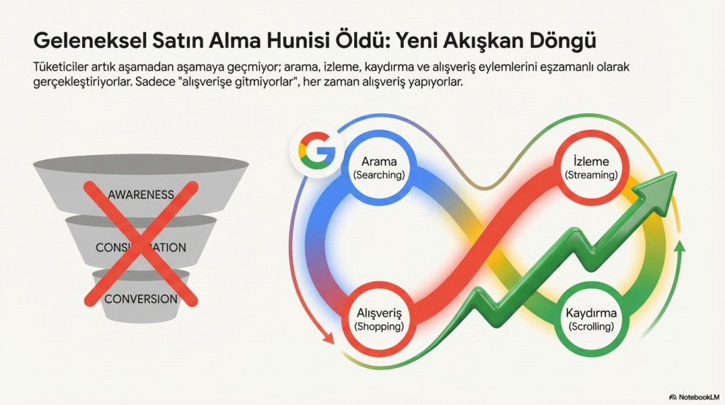 Geleneksel satın alma süreci bitti. Arama yap, karşılaştır, karar ver, satın al — bu sıralı adımlar artık geçmişte kaldı. 2026’da tüketici, arama yaparken izliyor, izlerken satın alıyor, satın alırken başka bir şey keşfediyor. Ve tüm bunları tek bir ekosistem içinde, anlık olarak yapıyor.